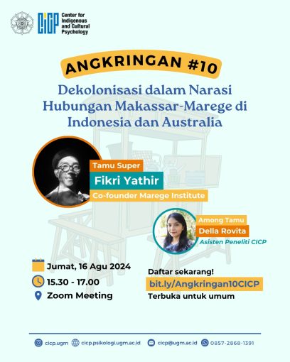 Bertepatan dengan menyongsong Hari Raya Kemerdekaan Indonesia yang ke-79, Pusat Studi Psikologi Indijinus dan Budaya (CICP), kembali melaksanakan acara Angkringan CICP pada, Jumat, (16/4), yang merupakan sesi kesepuluh dengan tema “Dekolonisasi dalam Narasi Hubungan Makassar-Marege di Indonesia dan Australia”. Acara ini dilaksanakan secara daring melalui platform Zoom dari pukul 15.30 hingga 17.00, dihadiri oleh berbagai kalangan peserta, mulai dari mahasiswa, dosen serta peserta yang tertarik dengan hubungan Makassar-Marege.