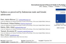 ABSTRACT. Adolescence is a transition phase filled with doubt and instability. During these transitions, some obstacles are often perceived as more intense and frequently cause adolescents to feel sad. This study was aimed to identify how male and female adolescents perceived sadness. A total number of 461 students, 273 females and 188 males, all of whom were high school students in Yogyakarta, completed an open-ended questionnaire, developed by Kim and Park (2006). The data was categorized, open-coded, axial-coded, and later cross-tabulated. Results demonstrated that females perceive negative moments as a life-lesson (30.4%), self reflection (13.9%), disruption (13.6%), life’s obstacles (8.1%), motivation (6.6%), memorable moments (6.6%), and lastly as a spiritual-lesson (2.6%). While males view sadness as a life lesson (22.9%), disruption (15.4%), self-reflection (11.2%), motivation (9.6%), memorable moments (5.9%), life’s obstacles (5.3%), and lastly as a spiritual lesson (3.2%). This result was later divided into two types of perception, the positive approach, containing life lesson, self-reflection, motivation, and spiritual lesson, and the negative approach, which are sadness as disruption, memorable moments, and life’s obstacles. This study concludes that both Indonesian male and female adolescent mainly took a positive perception on sadness as a life lesson, with only 27% of them viewing it as negative.