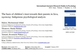 ABSTRACT. The word among is used to describe the parent-child relationship in Javanese cultural context. Javanese is one of ethnic groups in Indonesia. According to Dewantara (1968), among consists of three nurturing components: providing affection (asih), stimulating potentials of the child (asah), and fulfilling the needs of the child (asuh). The purpose of this study was to examine the relationship between the concept of among and the development of trust towards parents. This study examines the reasons why Javanese trust their mothers and fathers. A total number of 356 Javanese students (males = 97, females = 259) at Universitas Gadjah Mada completed open-ended questionnaires, asking how much they trust their parents, and the reasons why they trust their parents. The data was analyzed using indigenous psychological approach. Preliminary coding, categorization, axial coding and cross-tabulations were run accordingly. Results show as the following: first, the students tend to trust their mothers more than their fathers. Second, trust to mothers was more on the direction of emotional bonds, whereas trust to fathers was more related to the cultural expectations. The three components of among (asih, asah, and asuh) were also found in the results of the study and appeared to be frequently stated in the responses. The study concluded that Javanese children’s trust to mother tends to base on affectional (asih) and caring (asuh) aspects, while their trust to fathers laid on teaching and modeling (asuh) aspects. Many psychologists believe that the characteristics of children’s general trust which is growing in the family context become the basis of social relation in the social interaction. It is good to know that, so parents will also have to learn the expection of their children to facilitate them growing, and eventually leading to their fruitful accomplishments of the children. Parental education in forming the basic trust for facilitating the children’s growth in the local context is something we might need to develop and construct in the future. In the long future these will contribute, to the reduction of any conflicts and social friction, which (was suspected) originated from the lack of trust between social groups. A strong foundation of trust is eventually strenthening the establishment of harmonious society under the frame of Unity in Diversity (Bhinneka Tunggal Ika), the basis of Indonesian nationalism.