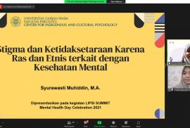 Pada Minggu (10/10), Junior Researcher CICP Syurawasti Muhiddin, S.Psi., M.A. menjadi pembicara dalam webinar yang diselenggarakan Lingkar Psikologi. Syura mengisi tema berjudul “Stigma dan Ketidaksetaraan Karena Ras dan Etnis terkait dengan Kesehatan Mental”. Webinar ini diselenggarakan melalui Zoom dan disiarkan langsung melalui kanal Youtube. Peserta berasal dari kalangan masyarakat umum yang tertarik dengan isu kesehatan mental dari berbagai daerah di seluruh dunia. Acara ini membahas kaitan perbedaan ras dan etnis yang dapat menjadi tantangan mencapai kesehatan mental. Syura menyampaikan bahwa perbedaan ras dan etnis ini memunculkan stigma yang menghambat seseorang dalam mencari pertolongan profesional. Penolakan dari masyarakat juga menjadi hal yang tidak terelakkan dari adanya stigma buruk pada Orang dengan Gangguan Jiwa (ODGJ). Syura menekankan pentingnya memahami kesehatan mental secara kontekstual. Selain itu, Indigenous Psychology sebagai studi ilmiah bersifat native dengan berbasis ide ilmu ‘dari masyarakat untuk masyarakat’’ mampu membantu menjembatani pemahaman pentingnya konteks dalam menangani isu gangguan mental di masyarakat. Pengetahuan mengenai kebudayaan setempat juga dibutuhkan untuk menanggapi isu kesehatan mental secara lokal. [Ratri/Humas CICP]