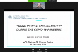 Salah satu riset yang sedang berjalan di CICP di bawah Dr. Wenty Marina Minza, M.A. berjudul “Young People and Solidarity during The Covid-19 Pandemic” dipresentasikan oleh Dr. Wenty dalam acara “APA Division 52 Webinar Series” yang diselenggarakan oleh American Psychological Association (APA). Webinar ini diadakan 25 Februari lalu pukul 11 pagi waktu timur (Amerika Serikat dan Kanada) atau pada pukul 11 malam waktu Indonesia bagian barat. Acara ini dimoderatori oleh salah satu peneliti rekanan CICP di riset COVID-19 yaitu Luca Tateo, Ph.D dan juga dihadiri Giuseppina Marsico, Ph.D.
