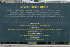 Center for Indigenous and Cultural Psychology (CICP) bersama Konsorsium Psikokultural Indonesia (KPI) membuka kesempatan bagi mahasiswa S-2 yang tertarik dengan multikulturalisme dan multietnis untuk berkolaborasi bersama kami. Kirimkan draft rencana riset (tesis) Anda ke cicp@cicp.psikologi.ugm.ac.id dan daftarkan diri Anda melalui sms dengan format KPI_NAMA_NIM_NOMOR HP ke 085328142337
