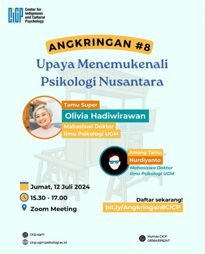 Jumat, 12 Juli 2024, Pusat Studi Psikologi Indijinus dan Budaya (CICP) sukses menggelar Angkringan CICP ke-8 dengan tema “Menemukenali Psikologi Nusantara.” Acara yang diadakan secara daring melalui platform Zoom ini menampilkan Olivia Hardiwirawan sebagai pembicara utama. Acara dimulai pada pukul 15.30 dan berlangsung hingga 17.00, menarik antusiasme dari berbagai kalangan, termasuk mahasiswa, dosen, peneliti, serta individu yang penasaran dengan kajian psikologi nusantara.
