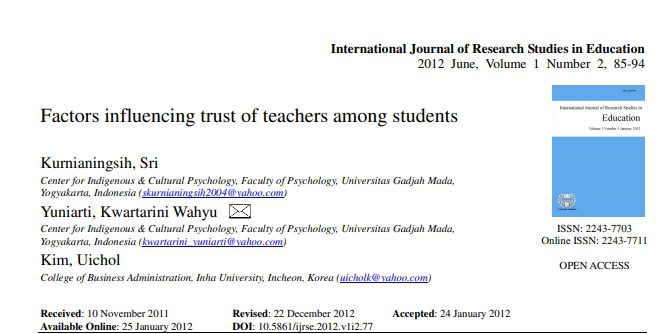 ABSTRACT. In Indonesia, Ki Hajar Dewantoro is one of the most respected scholars in education philosophy. He stated the importance of trust earned by teachers in guiding students in their learning activities. The teacher, as the leader in the class, needs to develop mutual trust between students and teachers. Trust to teachers is strongly required by students as a foundation in developing and expanding their relationship and also social network. It is also the fundamental element in their desire to pursue higher education, for it is only through a sense of trust that student will embrace an empowering sense of freedom and pursuit the knowledge. The exercise of this freedom requires a risk on behalf of students based on the trust of their teachers and the learning experience that they provide. If students trust their teachers, they will be more able to focus on the task at hand and to work and learn more effectively. A total number of 291 senior high school students in Yogyakarta (males=147, females=144) completed an open-ended questionnaire developed for this study that asks how much they trust their teachers and the reason why they trust their teachers. The data was analyzed using indigenous psychological approach of analyzing the content of open-ended responses, categorization of the responses and cross-tabulating with demographic/background information. Results indicated that 63% of participants stated that they trusted their teachers. The main reason for trusting their teachers are as follows: they are perceived as being similar to their parents, teachers’ ability in transferring knowledge, the relationship with teacher, and their abilities of guiding students. The study concluded that trust of senior high school students was established because of views that teachers are parents that have competence in delivering knowledge and are formally established as teachers. Therefore a teacher’s behavior that similarly represents a parent’s behavior at home will produce a child’s trust and this will become the foundation for the students to learn better.