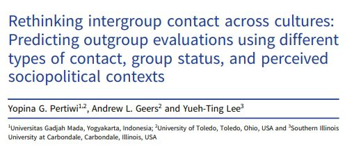 ABSTRACT. Two studies were conducted to examine the relationship between three different types of intergroup contact (i.e., direct contact, extended contact, and online contact) and outgroup evaluation, and the moderating effect of group status and sociopolitical contexts across two cultural contexts. A total of 75 European Americans (majority) and 44 Chinese Americans (minority) participated in Study 1; whereas 61 Javanese (majority) and 72 Chinese Indonesians (minority) participated in Study 2. In both studies, participants completed an outgroup feeling thermometer as well as a set of questionnaires measuring intergroup contact, perceived outgroup political power, perceived outgroup economic power, perceived government support, and perceived quality of the current intergroup relations. Results from the two studies revealed that although contact was beneficial in both cultural contexts, there were notable moderators of the links between contact and outgroup evaluations. Specifically, the value of direct contact was greater for the minority group members in the United States, extended contact only mattered in a specific condition when the perceived government support was taken into account in the United States, and online contact was beneficial across group status in the Indonesian context. Overall, the findings provide evidence of the need to take into account the role of specific sociopolitical relations between the two groups in intergroup relations research.