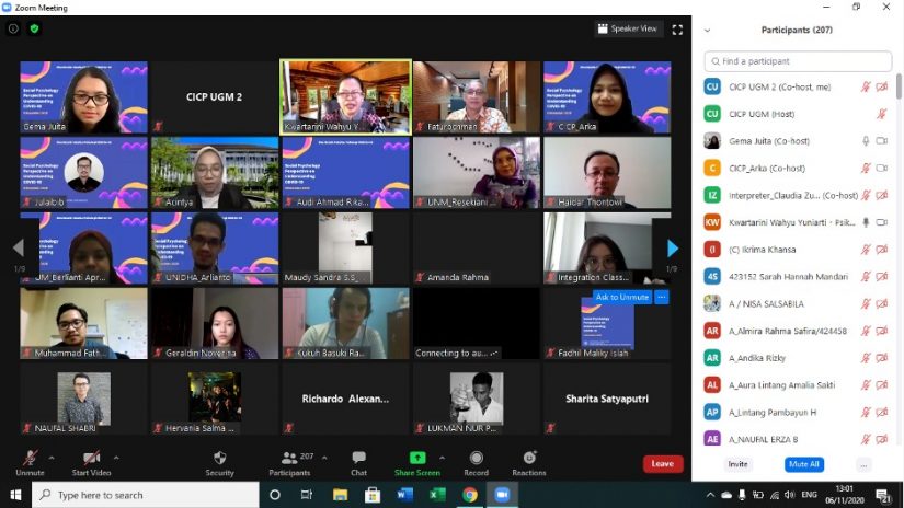 Visiting Professor dihadiri oleh 368 partisipan yang terdiri dari mahasiswa, akademisi, dan peneliti. Partisipan tersebut tidak terbatas hanya dari Yogyakarta saja, tetapi dari berbagai daerah lain pula. Kegiatan tersebut dibawakan dalam bahasa inggris dan sudah tersedia penerjemah dari panitia. Tugas penerjemah adalah merangkum apa yang disampaikan narasumber dan menuliskannya di kolom komentar agar dapat dibaca oleh partisipan. Sesi pertama yaitu presentasi dari Dr. Wenty Marina Minza, S.Psi., M.A. dengan judul “Social Perception of the Covid 19 Pandemic: Continuities and Change“. Beliau menyampaikan bahwa masyarakat Indonesia memandang pandemi ini sebagai ancaman, ditunjukkan dengan tingginya tingkat kecemasan. Meskipun begitu, budaya kolektivis membantu masyarakat mengatasi kecemasan tersebut. Sejalan dengan presentasi beliau, Prof. Dr. Faturochman, M.A. menyampaikan dalam presentasinya yang berjudul “Covid 19: Prevention and Optimism” bahwa adanya kolektivisme kuat di masyarakat mengarah pada tingginya level optimisme pada masyarakat Indonesia dan bahwa pandemi akan segera teratasi. Adapun hal yang perlu ditingkatkan adalah perilaku preventif terhadap virus, karena kesadaran masyarakat terkait penyebaran virus masih tergolong rendah.